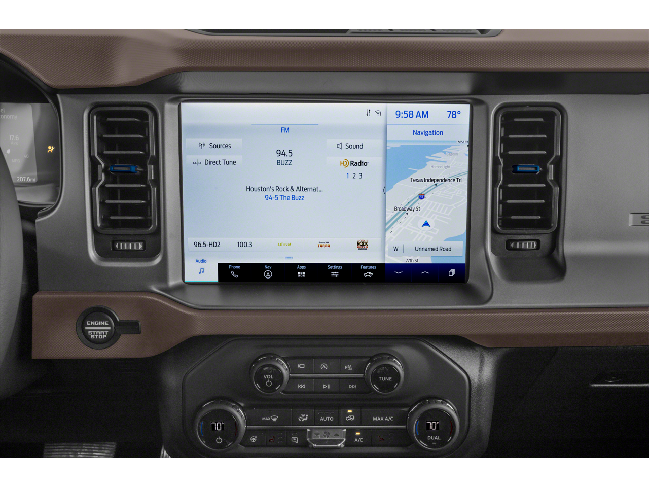 The Lux Package on this Bronco elevates the experience with premium features like a 12-inch touchscreen display, wireless charging, a Bang & Olufsen sound system, and a 360-degree camera system. Stay connected with the built-in navigation system and enjoy the convenience of smart charging USB ports and a heated steering wheel. The adaptive cruise control and evasive steering assist technologies provide added peace of mind on the road.